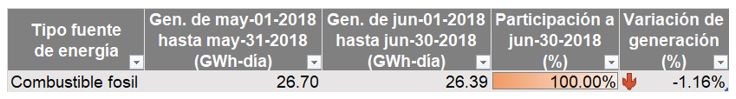El total de la generación con recursos no renovables (combustible fósil) para el mes de junio fue de 26.39 GWh-día (decrecimiento de un 1.16% en relación con mayo de 2018).