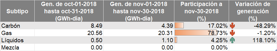 El total de la generación con recursos no renovables para el mes de noviembre (combustible fósil) fue de 29.55 GWh-día (decrecimiento de un 12.70% en relación con el mes anterior).