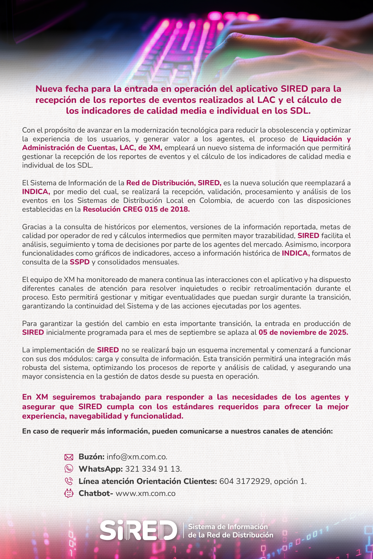 Nueva fecha para la entrada en operación del aplicativo SIRED para la recepción de reportes de eventos realizados al LAC y cálculo de indicadores de calidad media e individual en los SDL
