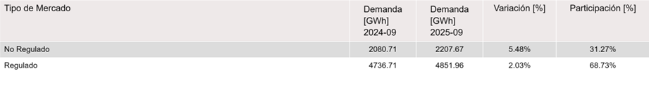 En septiembre de 2025 la demanda de energía fue de 7,095.18 GWh, lo que significa que aumentó 2.85 % en comparación con el consumo nacional de septiembre de 2024, donde la demanda fue de 6,868.07 GWh. Cabe resaltar que, de las diez regiones del país, la que tuvo mayor consumo de energía fue Caribe con 2,044.12 GWh, seguida por Centro con 1,677.80 GWh, y por Oriente con 977.95 GWh.