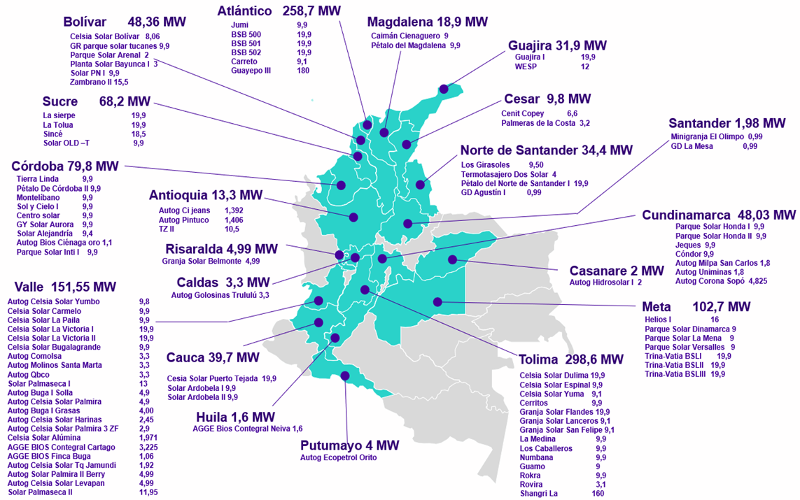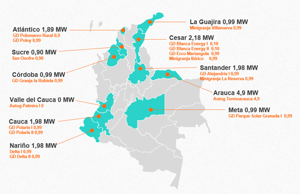 Al cierre del 30 de septiembre de 2025 se tenían 1.221,7 MW en 98 proyectos de generación aportando energía al Sistema Interconectado Nacional en estado de pruebas iniciales, es decir, conectados al Sistema para realizar las pruebas requeridas para su puesta en operación, en cumplimiento de la normativa vigente y los protocolos de pruebas definidos por el Consejo Nacional de Operación. De la totalidad de proyectos en pruebas, 66 de ellos correspondientes a 632,5 MW se encontraban en operación comercial durante el período de transición de las Resoluciones CREG 148 de 2021 y101 011 de 2022. En la siguiente imagen se detalla su ubicación.