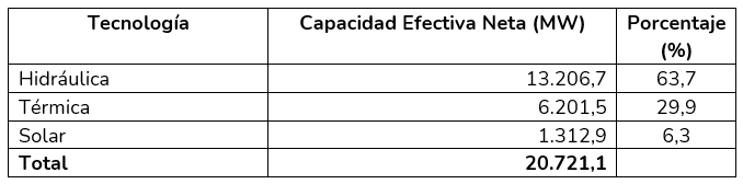 XM, en calidad de operador del sistema, continúa trabajando en la diversificación y transformación energética de la matriz de generación de energía eléctrica, la cual contó con una capacidad efectiva neta de 20.721 MW con corte al 30 septiembre de 2025, en donde el 6.3 % proviene de fuentes de energía solar. Adicionalmente, ingresaron al Sistema proyectos de generación que corresponden a plantas no despachadas centralmente con una capacidad efectiva neta menor a 20 MW, entre los que se encuentran autogeneradores a gran escala y generación distribuida.
