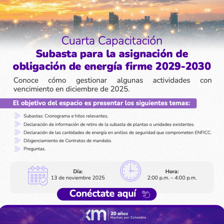 El próximo jueves 13 de noviembre de 2025 entre las 2:00 y las 4:00 p.m. se realizará la Cuarta Capacitación de la Subasta del Cargo por Confiabilidad 2029-2030 convocada por la Resolución CREG 101 079 de 2025.