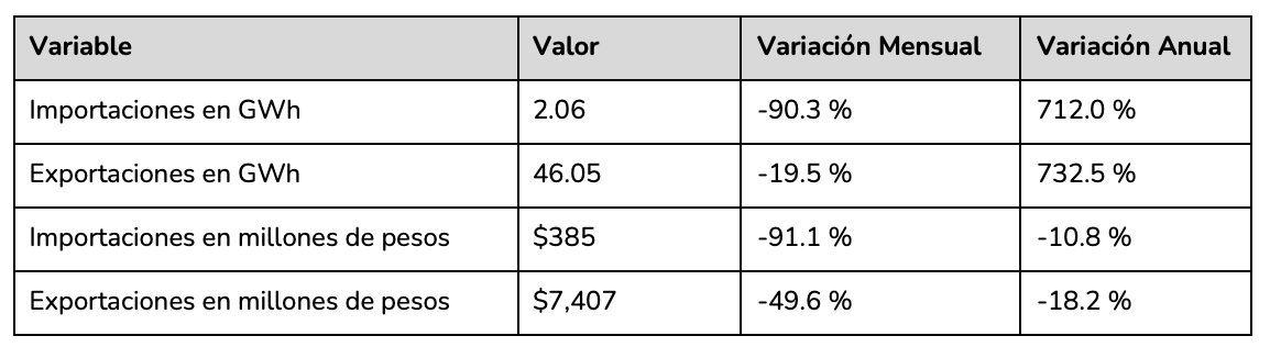 • Las exportaciones de energía hacia Ecuador fueron de 46 GWh, 11 GWh menos que lo exportado el mes anterior, cuyo valor fue 57 GWh.