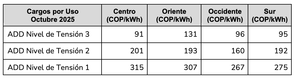 Los cargos por Áreas de Distribución (ADD) representan el costo asociado al uso de los sistemas de distribución, necesarios para llevar la energía eléctrica hasta el usuario final. El Ministerio de Minas y Energía estableció la creación de estas áreas con el propósito de unificar los cargos por uso de los usuarios que pertenezcan a una misma ADD, aun cuando hagan parte de diferentes mercados de comercialización.