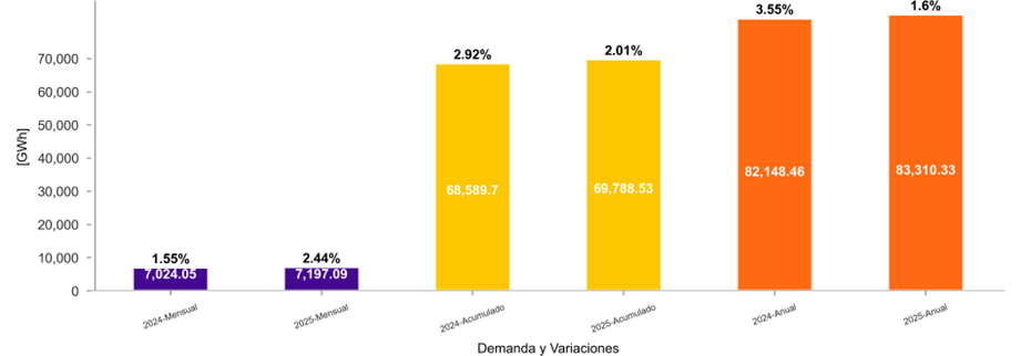 La demanda de energía eléctrica en octubre de 2025 aumentó 2.44 % respecto a octubre de 2024. Por otra parte, en lo que va acumulado del año 2025 y con corte al 31 de octubre, se tuvo un crecimiento del 2.01 % de la demanda de energía del SIN en comparación al mismo periodo de 2024.