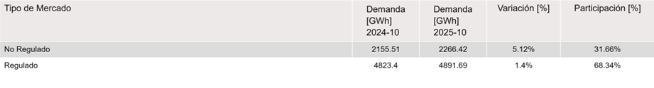 Dentro de las actividades económicas de mayor participación de demanda de energía en el mercado no regulado para octubre de 2025 respecto a octubre de 2024, se destacan: Industrias manufactureras con 911.88 GWh y Explotación de minas y canteras con 702.40 GWh, que representan un 40.23% y 30.99 % de la demanda no regulada, respectivamente.