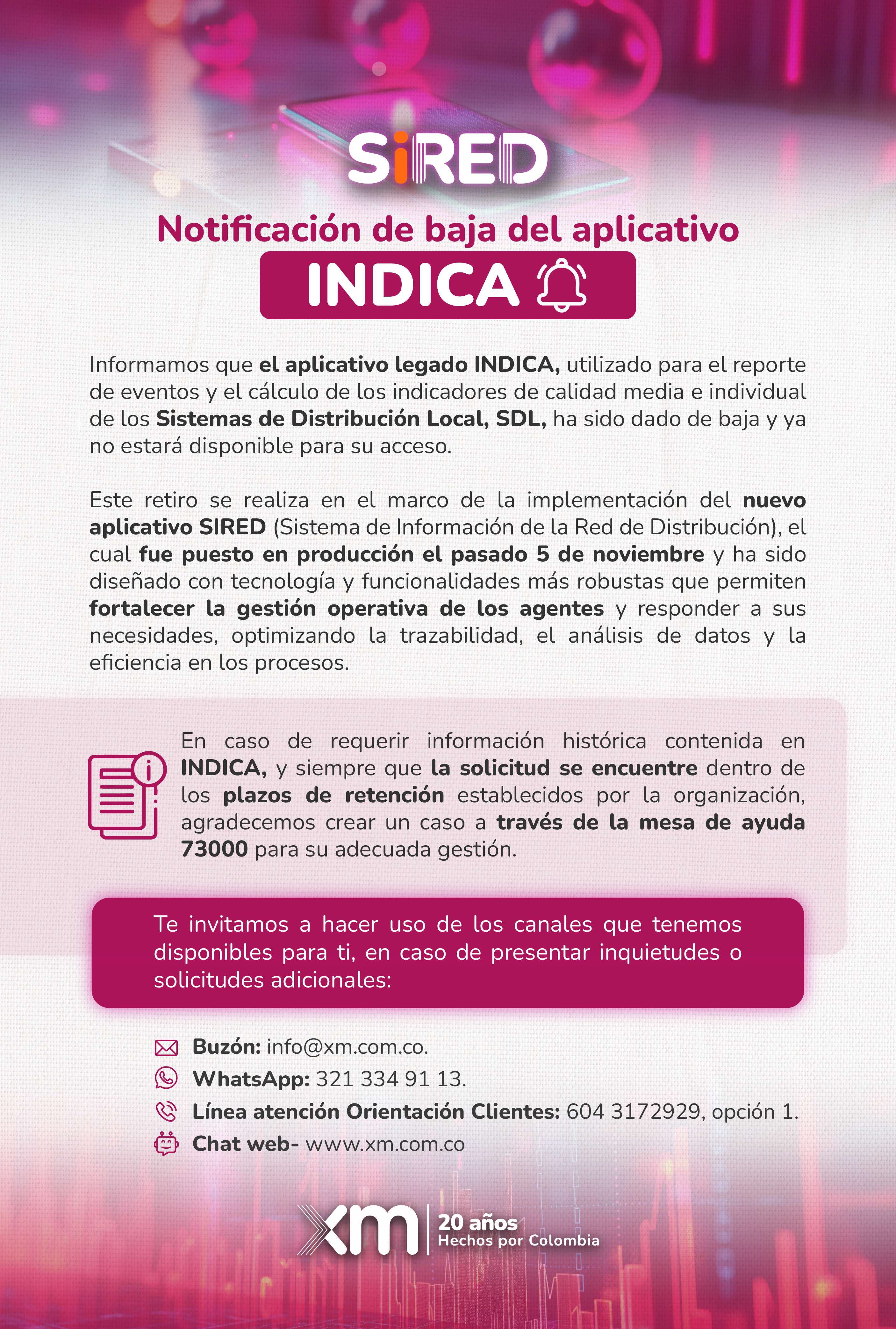 Notificación de baja del aplicativo legado INDICA
