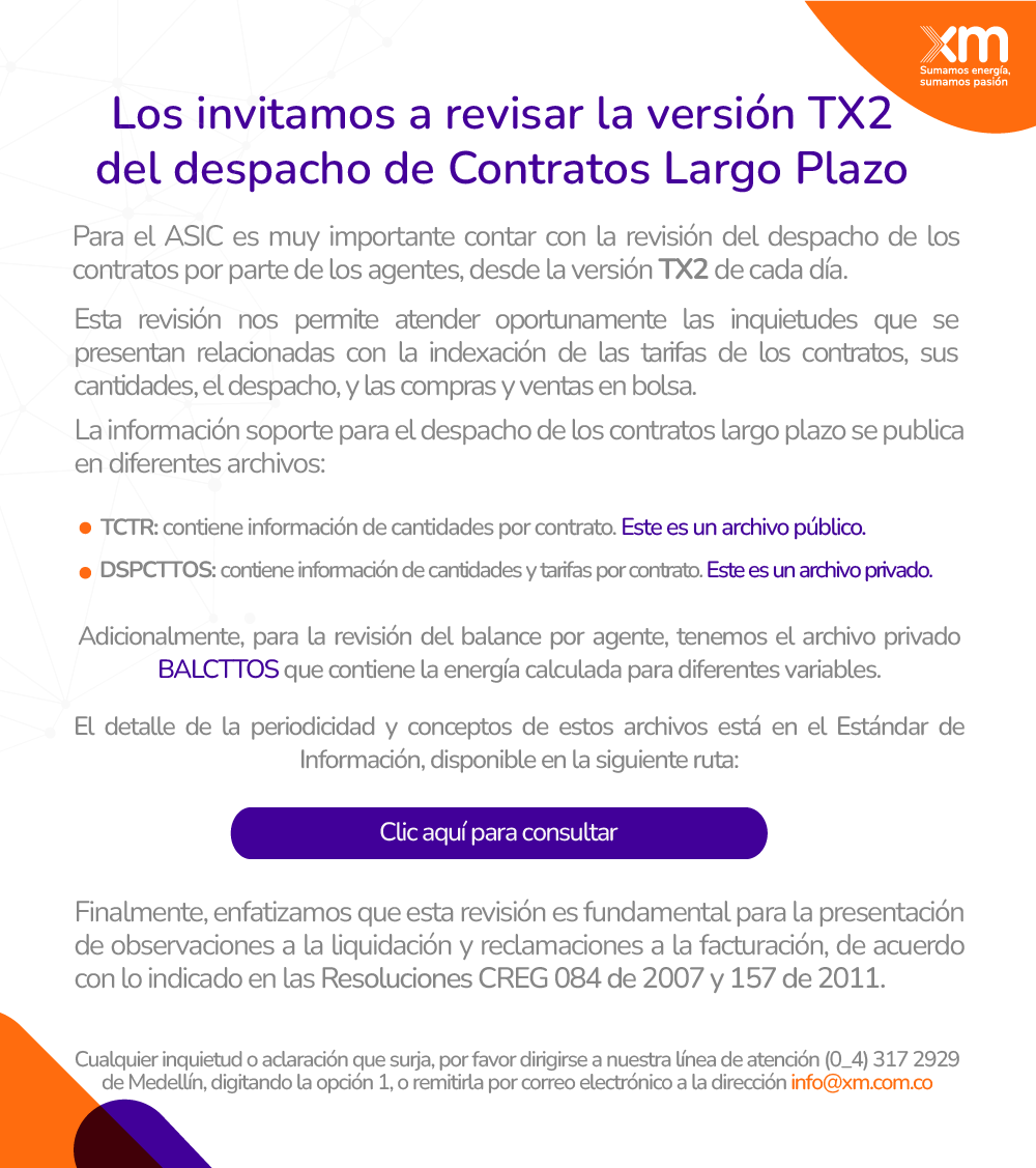 Agentes comercializadores y generadores, los invitamos a revisar la versión TX2 del despacho de Contratos LP
