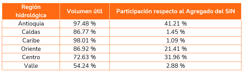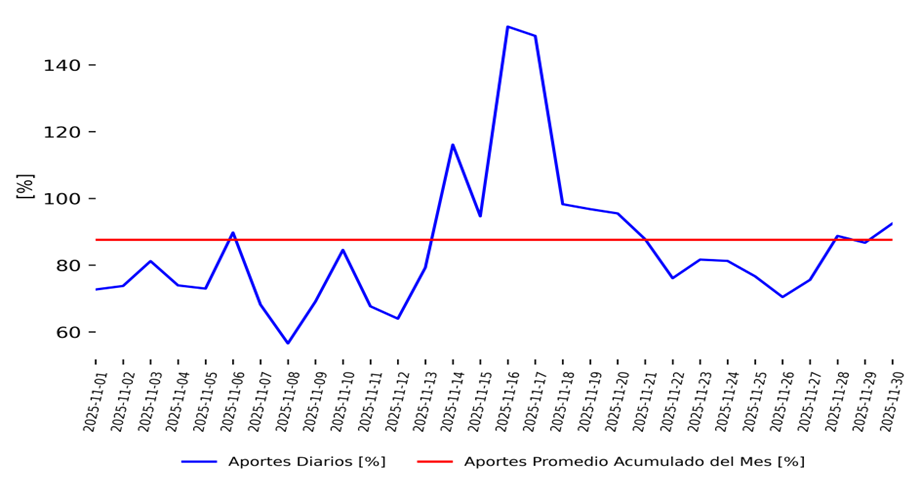 Los aportes hídricos cerraron noviembre con un promedio acumulado de 87.61 % (237.07 GWh-mes), ubicándolos por debajo de la media histórica de dicho mes (270.61 GWh-mes). Los aportes hídricos por regiones fueron: Oriente con 68.65 %, Valle con 106.51 %, Centro con 76.95 %, Antioquia con 93.31 %, Caldas con 73.17 % y Caribe con 118.78 %.