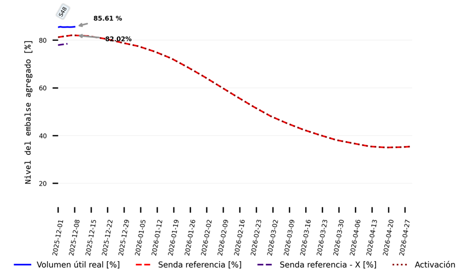 A partir del 1 de diciembre con el inicio de la estación de verano se calculó una nueva senda de acuerdo con los supuestos definidos por la Comisión en cumplimiento del marco regulatorio actual. Respecto a esa nueva senda y para el día 16 de diciembre, el nivel agregado del embalse del sistema se ubicó 2.03 (83.40%) puntos por encima de la senda de referencia 81.37%) establecida por la CREG.