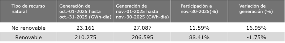 El 88.41 % de la generación, equivalente a 206.59 GWh-día promedio, fue producto de recursos renovables, mientras que el 11.59 % restante, equivalente a 27.09 GWh-día promedio, fue de recursos no renovables.