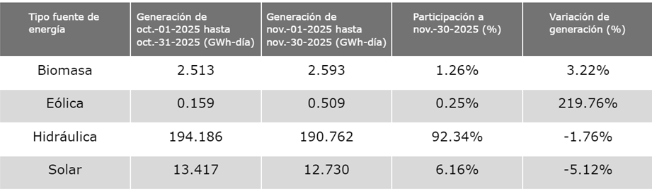 Con respecto a las Fuentes de Energía Renovables No Convencionales -FNCER- se tuvo que durante el mes de noviembre del 2025 las plantas solares generaron en promedio 12.73 GWh-día, representando un 6.16 % del total de la generación renovable (5.12 % menos respecto al mes de octubre del 2025), mientras que las plantas eólicas aportaron un 0.25 % de la generación renovable equivalente a 0.51 GWh-día (219.76 % más respecto a octubre del 2025).