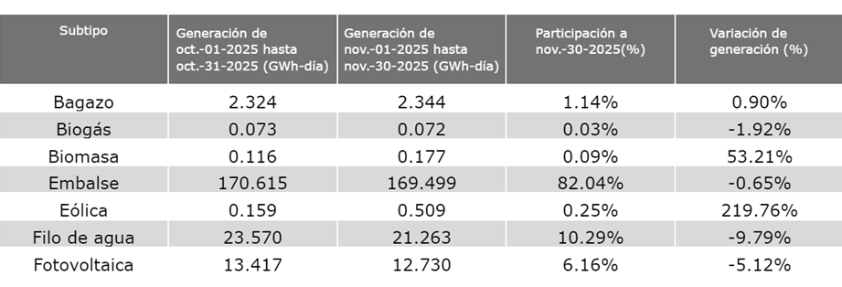 En total, en noviembre se generaron 7010.45 GWh. En promedio durante el mes, la generación de energía fue de 233.68 GWh-día, 0.11 % más comparado con la generación de octubre de 2025 que fue de 233.44 GWh-día. (Se incluyen las exportaciones hacia Ecuador).