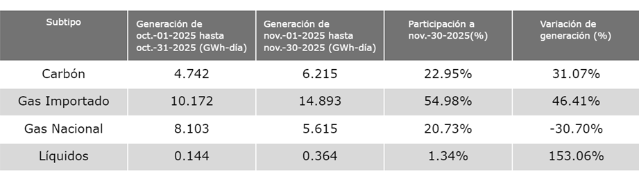 Por fuente de energía, la generación con carbón representó un 22.95 %, equivalente a 6.22 GWh-día promedio (31.07 % más con relación al mes anterior), el gas nacional con un 20.73 %, equivalente a 5.61 GWh-día promedio (30.7 % menos con relación al mes anterior), y el gas importado con una participación de 54.98 %, equivalente a 14.89 GWh-día promedio (46.41% más respecto al mes anterior).