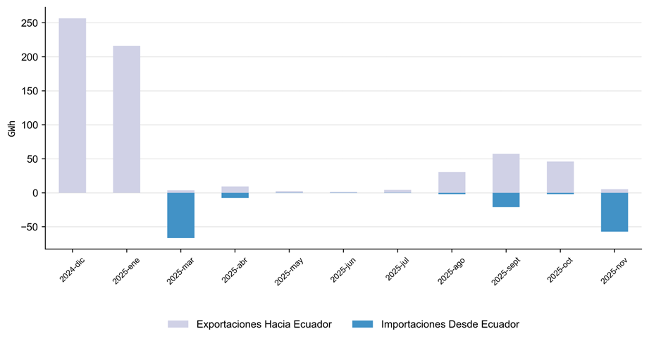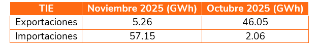 En el mes de noviembre las Transacciones Internacionales de Electricidad, TIE, con Ecuador, Colombia importó 57.15 GWh, y exportó un total de 5.26 GWh, 88.57 % por debajo de los valores de exportación del mes anterior (46.05 GWh).