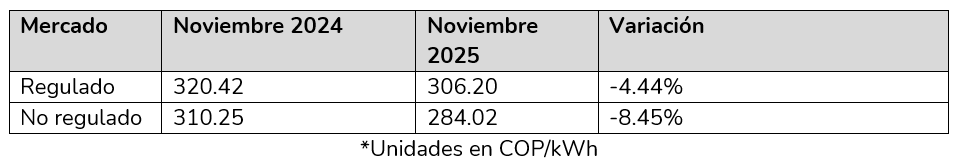 Durante noviembre de 2025 el precio promedio de la energía transada en contratos para atender la demanda del consumo residencial y pequeños negocios (mercado regulado) fue de 306.20 COP/kWh, mientras que para la industria y el comercio (mercado no regulado), fue de 284.02 COP/kWh. Tanto el precio del mercado regulado como del no regulado presentaron una disminución de 1.30 % y 0.79 %, respectivamente con relación a los precios del mes de octubre de 2025, que fueron de 310.23 COP/kWh y 286.29 COP/kWh.
