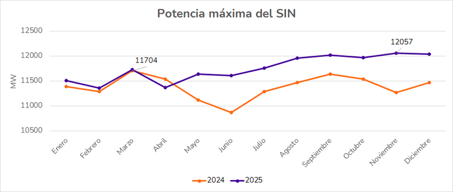 En términos de potencia eléctrica, en 2025 la demanda máxima de potencia se registró el miércoles 26 de noviembre en el periodo 19, alcanzando un valor de 12,056.8 MW. Esta cifra fue 3.01% superior a la del año anterior (11,704.4 MW), donde, a nivel mensual se evidenciaron crecimientos bajos entre los meses de enero y abril, derivados de la influencia del fenómeno El Niño durante el primer trimestre de 2024. No obstante, a partir de junio de 2025, se superó de forma consistente lo registrado en 2024 y se presentó un crecimiento sostenido, reflejando la tendencia de mayor consumo eléctrico en ese período.