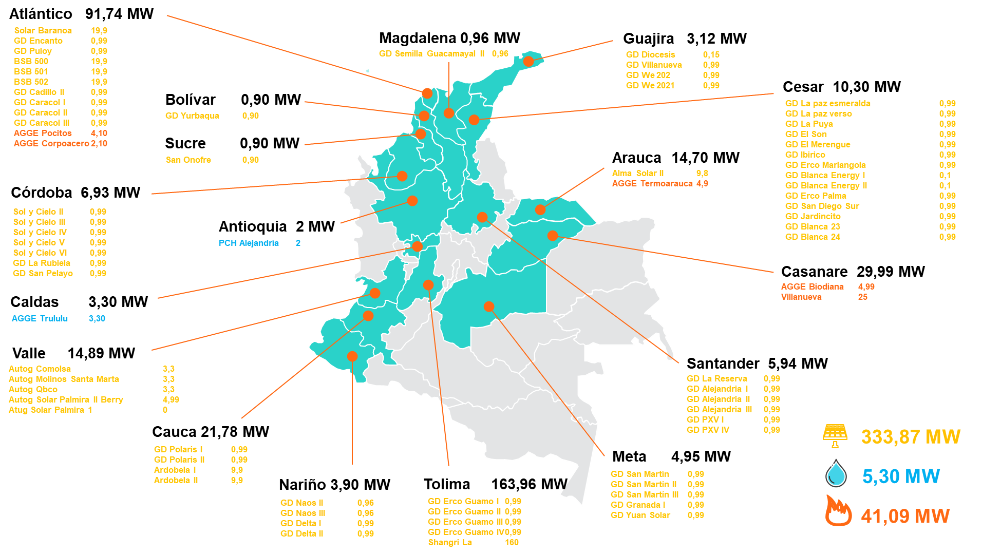 5 proyectos de autogeneración a gran escala que entregan energía al SIN, los cuales están reglamentados por la Resolución CREG 174 de 2021, es decir, se conectan en el SDL y tienen una potencia de exportación a la red inferior a 5 MW.