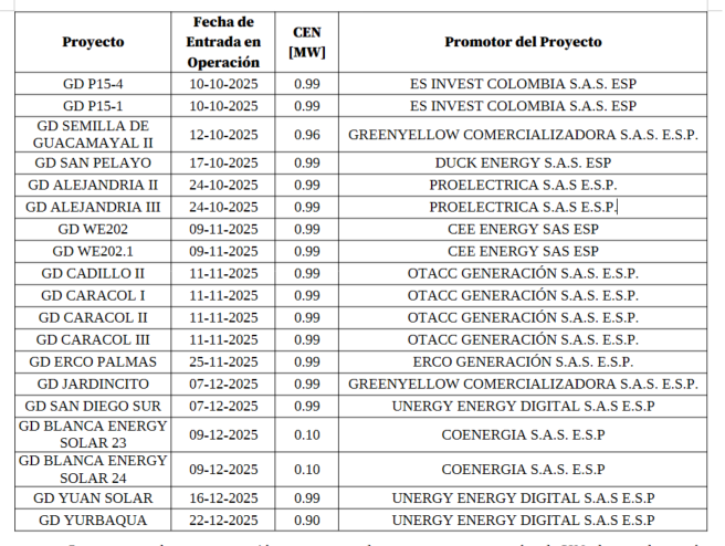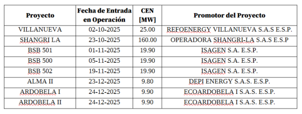 El operador ENEL COLOMBIA S.A. E.S.P declaró en operación comercial los siguientes proyectos: