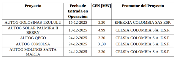 Durante el cuarto trimestre de 2025 ingresaron al sistema Interconectado Nacional, SIN, 60 proyectos, de los cuales, 32 proyectos son de generación que suman 309.40 MW; 8 son proyectos que conectan carga en el sistema, es decir proyectos que consumen energía directamente de la red, 12 que entraron a reforzar las redes del sistema de Transmisión Regional, STR y 8 proyectos que refuerzan la red del Sistema de Transmisión Nacional, STN.