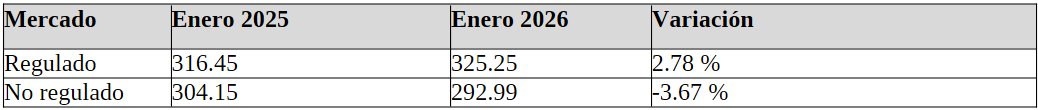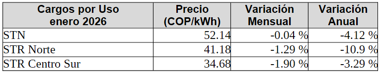 Durante enero de 2026 el precio promedio de la energía transada en contratos para atender la demanda del consumo residencial y pequeños negocios (mercado regulado) fue de 325.25 COP/kWh, mientras que para la industria y el comercio (mercado no regulado), fue de 292.99 COP/kWh. Tanto el precio del mercado regulado como del no regulado presentaron un aumento de 7.16 % y 1.71 %, respectivamente con relación a los precios del mes de diciembre de 2025, que fueron de 303.52 COP/kWh y 288.05 COP/kWh.