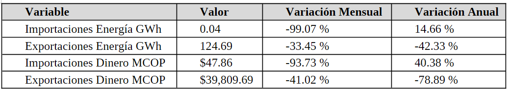 - Las exportaciones de energía hacia Ecuador fueron de 124.69 GWh, 62.69 GWh menos que lo exportado el mes anterior, cuyo valor fue 187.38 GWh. Cabe destacar que, de acuerdo con las disposiciones del Ministerio de Minas y Energía, las transacciones TIE con Ecuador fueron suspendidas a partir del 22 de enero de 2026.
