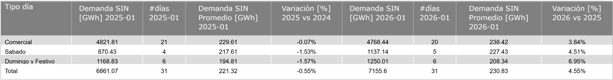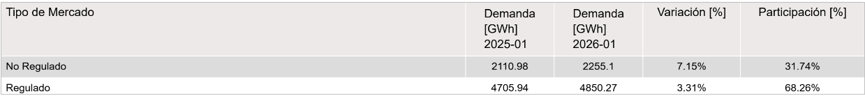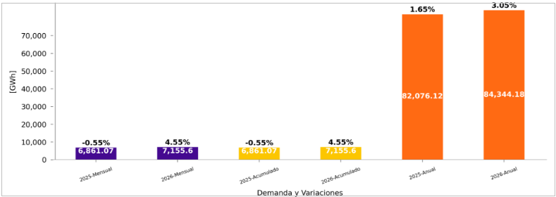 En enero de 2026 la demanda de energía fue de 7,155.60 GWh, lo que significa que aumentó 4.55 % en comparación con el consumo nacional de enero de 2025, donde la demanda fue de 6,861.07 GWh.