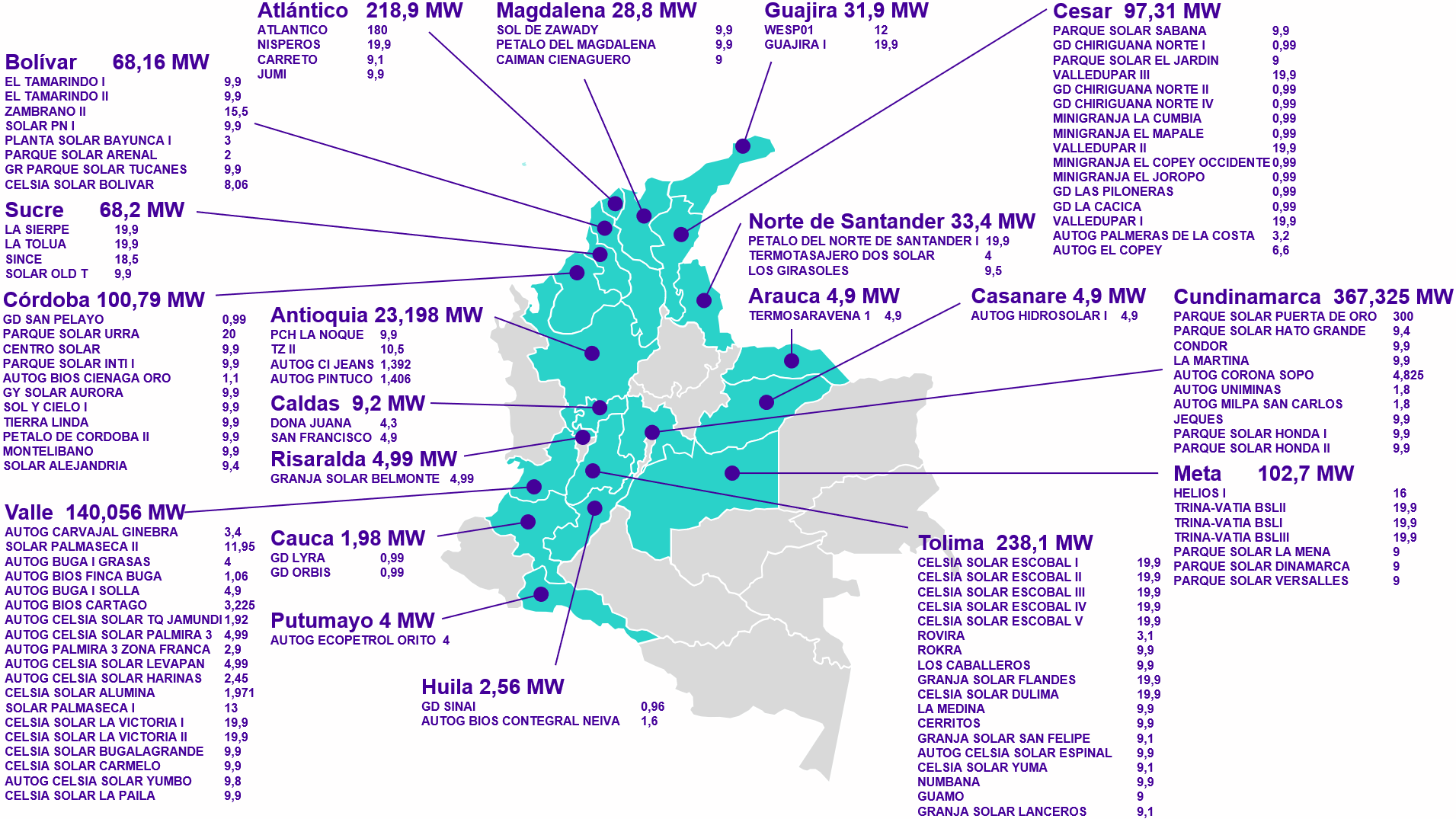 A corte del 31 de marzo de 2026 se tenían 1.551,37 MW aportando energía al SIN en estado de pruebas iniciales, es decir, conectados al SIN para realizar las pruebas requeridas para su puesta en operación, en cumplimiento de la normativa vigente y los protocolos de pruebas definidos por el Consejo Nacional de Operación. De los 119 proyectos que se encontraban en pruebas, 112 corresponden a proyectos de generación solar y 3 a proyectos de generación eólica. En la siguiente imagen se muestra su ubicación.