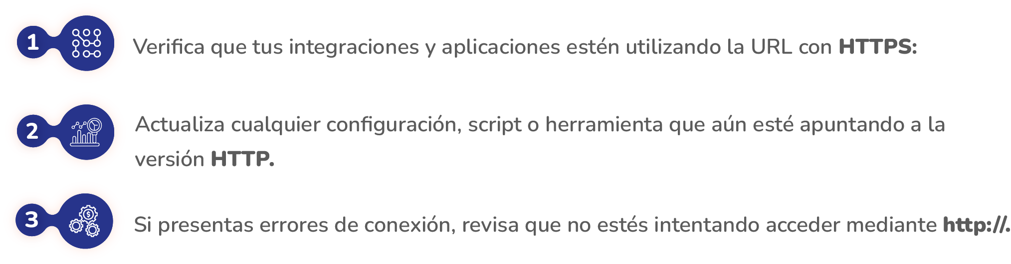 A partir de ahora, todos los accesos deben realizarse exclusivamente mediante el protocolo HTTPS, lo que garantiza una comunicación cifrada entre los sistemas de los usuarios y la API, protegiendo así la integridad y confidencialidad de los datos transmitidos.