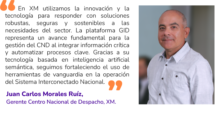 La Gestión Integral de Demanda de Energía, GID, es una plataforma desarrollada por Fáctica y XM con tecnología Léxica. Cuenta con 70 integraciones de input de otras aplicaciones y datos que los agentes reportan diariamente, lo que permite potenciar la coordinación y comunicación entre todos los actores y fortalecer la confiabilidad del Sistema Interconectado Nacional, SIN.
